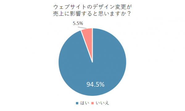 「ウェブサイトのデザイン変更が売上に影響すると思いますか?」の質問に対し、94.5%もの人が「はい」と回答しました。消費者はウェブサイトのデザインを通じて、企業のブランドイメージや商品の品質を判断する傾向にあるようです。