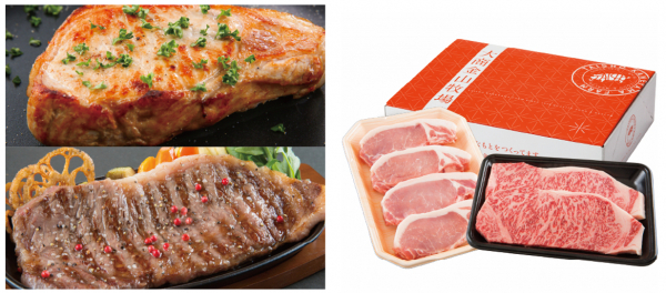 『山形牛・米の娘ぶた贅沢ステーキセット』は、柔らかい肉質とあっさりと甘い脂が特長の自社ブランド豚「米の娘(こ)ぶた(R)」のステーキ用ロース肉4枚と、山形県が誇るブランド和牛「山形牛」のステーキ用ロース肉2枚がセットになった、贈り物にピッタリの商品です。