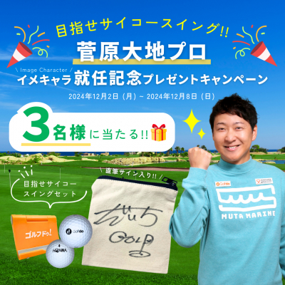株式会社ゴルフ・ドゥ(本社:さいたま市 代表取締役社長:佐久間功 以下、当社)の運営する公式Instagram「【公式】ゴルフドゥ!(以下、公式Instagram)」では、菅原大地プロ(ハンズゴルフクラブ所属)が新たに当社のイメージキャラクターに就任したことを記念し、2024年12月8日(日)までの期間、「菅原大地プロイメージキャラクター就任記念プレゼントキャンペーン」を実施中です。