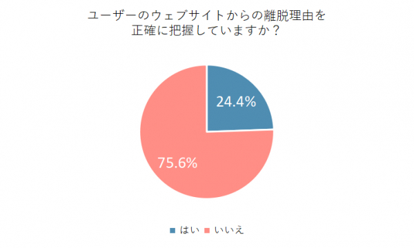 ユーザーのウェブサイトからの離脱理由を正確に把握しているかという質問に対し、75.6%の人が「いいえ」と回答しました。この結果から、自社のウェブサイトに対する認識や、ユーザーの行動パターンに対する理解が十分でない可能性が考えられます。
