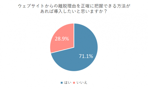 ウェブサイトからの離脱理由を正確に把握できる方法があれば導入したいかたずねたところ、「はい」と回答した人は71.1%にのぼりました。回答者の多くが、自社のウェブサイトの改善に積極的な姿勢を持っているようです。