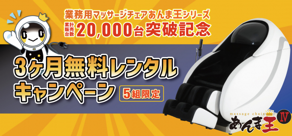 今回、「あんま王」シリーズの累計販売台数が20,000台を突破したことを記念し、新たに設置を希望する施設の中から抽選で5組限定で、最新モデル「あんま王IV」を1台、3ヶ月無料でレンタルするキャンペーンを実施することにいたしました。このキャンペーンを機に、これまでに設置されてこなかった施設においても、(1)施設利用者の待ち時間の有効活用 (2)空きスペースの収益化 (3)施設の付加価値アップ など業務用マッサージチェアのメリットを実感していただきたいと考えています。マッサージチェアの導入を検討されている事業者・施設さまは、ぜひご応募ください。