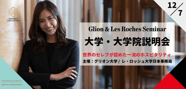グリオン大学およびレ・ロッシュ大学は、2024年12月7日(土)に「大学/大学院進学説明会」をオンラインで開催いたします。ホスピタリティ業界のリーダーを目指す中高生や、大学院進学を検討している大学生・社会人の皆様に、世界トップクラスの教育プログラムとキャンパスライフ、また業界トップレベルの企業でのインターンシップやキャリアについて詳しくご紹介します。