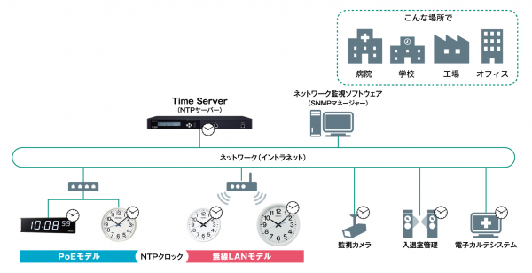 NTPクロックは、NTPサーバーから時刻を受信・補正し、施設内のパソコンやシステムと同じく正確な時刻を表示するネットワーク型時計です。セイコーソリューションズのNTPクロックは、2019年2月の製品発売以降、病院や学校、工場、オフィスなど2,000社以上のさまざまな施設に導入されています。なかでも無線LANモデルは配線工事が不要で既存の無線LAN環境を活用できるため、より手軽に導入が可能です。