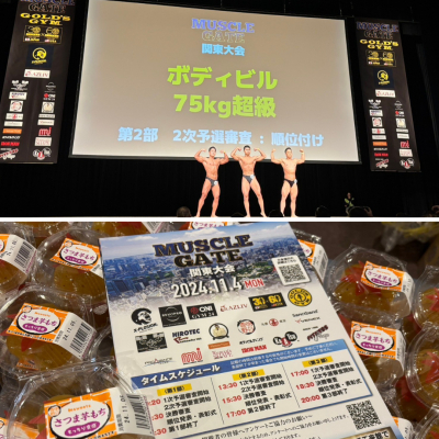 ボディビルダーの憧れゴールドジムが主催するボディコンテスト「マッスルゲート関東大会」(11/4・市川市文化会館)が行われ、明日香野は協賛企業として、和菓子「和sweets さつま芋もち」を振る舞いました。