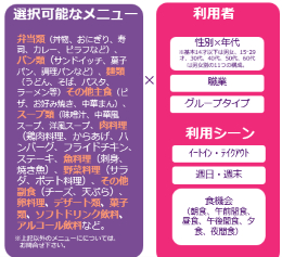選択可能なメニュー:弁当類(丼物、おにぎり、寿司、カレー、ピラフなど)、パン類(サンドイッチ、菓子パン、調理パンなど)、麺類(うどん、そば、パスタ、ラーメン等)その他主食(ピザ、お好み焼き、中華まん)、スープ類(味噌汁、中華風スープ、洋風スープ、肉料理(鶏肉料理、からあげ、ハンバーグ、フライドチキン、ステーキ、魚料理(刺身、焼き魚)、野菜料理(サラダ、ポテト料理)、その他副食(チーズ、天ぷら)、卵料理、デザート類、菓子類、ソフトドリンク飲料、アルコール飲料など。