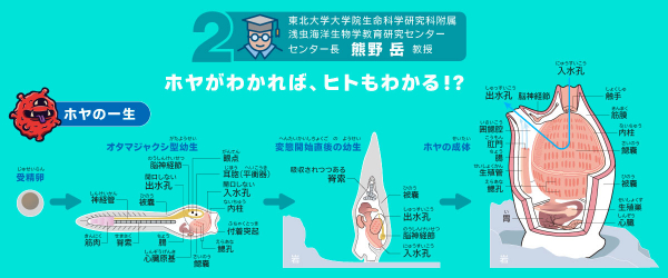 ホヤは、人間と同じ「脊索動物(せきさくどうぶつ)」に属する生き物で、幼生のときにはオタマジャクシのような形をしているんだ。幼生のホヤは、ヒトの脳と似た基本構造を持っていて、小さな目(眼点)もあるんだよ。成長して成体になると、幼生のころにあった筋肉や神経のつながりがなくなってしまうという、不思議な生態を持っているんだ。これがホヤの大きな特徴の一つで、成体になると岩などにくっついて動かないようになるんだって。