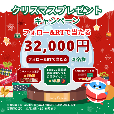 EaseUS Software Co., Ltd.は2024年12月5日(木)より、公式Xにてクリスマスキャンペーンを開催しております。抽選で20名様に総額32,000円以上の賞品をプレゼントいたします。応募方法は以下のようで、ぜひこのチャンスをお見逃しなく!
