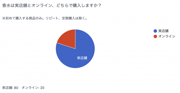 香水の購入場所について、「実店舗」が80%「オンライン」が20%と多数の人が実店舗での購入をしているという結果になりました。 やはり香りは視覚情報だけでは理解することが難しく、一度香りを試すという工程が大切であることが分かります。