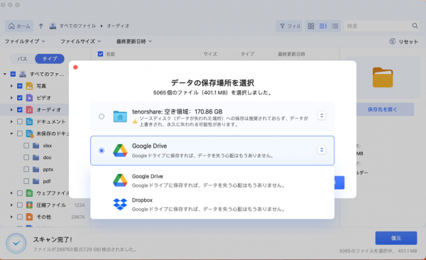 3.復元したいファイルを選択します。保存場所を選択し、例えばGoogle DriveまたはDropboxなどのクラウドディスクに保存することを検討してください。