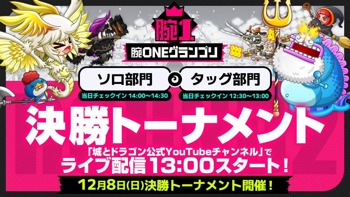 株式会社アソビズム(本社:東京都千代田区、代表取締役:大手智之)は、App Store・Google Playにて好評配信中の『城とドラゴン』において、「城ドラフェス2024-2025」に向けた公式大会となる「腕ONEグランプリ第2回大会 ソロ/タッグ決勝」の模様を12月8日(日)13:00より『城とドラゴン』公式YouTubeチャンネルで生配信することをお知らせいたします。