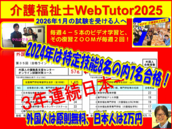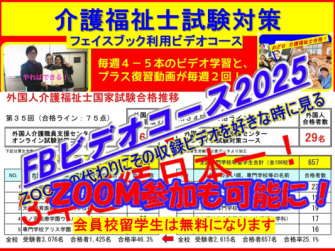 外国人介護教育をサポートする一般社団法人外国人介護職員支援センター(千葉県市川市、代表理事 井上文二)では、来年(2025年)も2月より1年間コースの外国人向け介護福祉士国家試験対策オンライン講座を開催します。コースは2種類を用意し、ビデオ学習とZOOM授業出席がセットになった「WebTutorコース」では、従来、特定技能外国人のみを対象に、雇用施設・支援機関等側の経済的補助を受けられない場合に受講料を無料にしていましたが、今回より、その受講料無料の対象をすべての外国人介護職に拡大しました。一方、同一カリキュラムでZOOM授業出席を任意とする「FBビデオコース」については、日本人、外国人ともに受講料3万円のままになります。