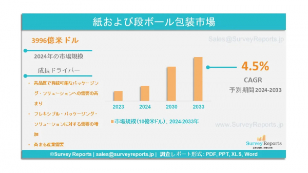 Survey Reports LLCは、2024年12月に調査レポートを発行したことを発表した。紙および板紙包装市場のセグメンテーション(素材別:段ボール、クラフト紙、成形パルプ、特殊紙、その他)、包装タイプ別(段ボール箱、袋および袋、折りたたみ式カートン、ラップ、カップ 、その他)によるエンドユース産業(食品・飲料、パーソナルケア・化粧品、Eコマース、ヘルスケア、ホームケア、電気・電子、自動車・産業、その他)による市場分析、動向、機会、予測、2024年から2033年までを提供する。これは、紙および板紙包装市場の予測評価を提供する。紙および板紙製パッケージ市場の成長要因、市場機会、課題、脅威など、いくつかの主要な市場力学を強調している。