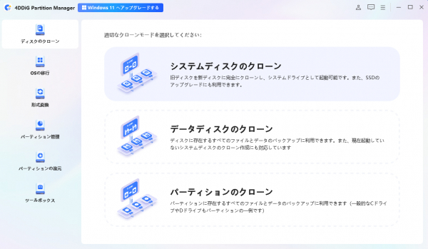 手順1.外部ディスクをコンピュータに接続し、4DDiG Partition Managerをダウンロードしてインストールします。その後、アプリケーションを起動し、「システムディスクのクローン」を選択してください。