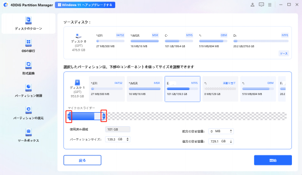 手順2.ソースディスクからクローンデータを受け取るターゲットディスクを選択し、クローンディスクの効果を示すプレビューインターフェースが表示されます。プレビューが正しいことを確認したら、「開始」ボタンをクリックしてクローン操作を開始します。