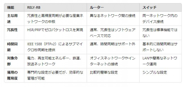 RELY-RBは、ルーターや通常のスイッチとは異なる、高可用性ネットワーク専用の冗長性と同期機能を持つデバイスです。特に、ミッションクリティカルな産業用ネットワークでの使用を想定しています。