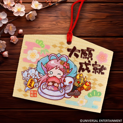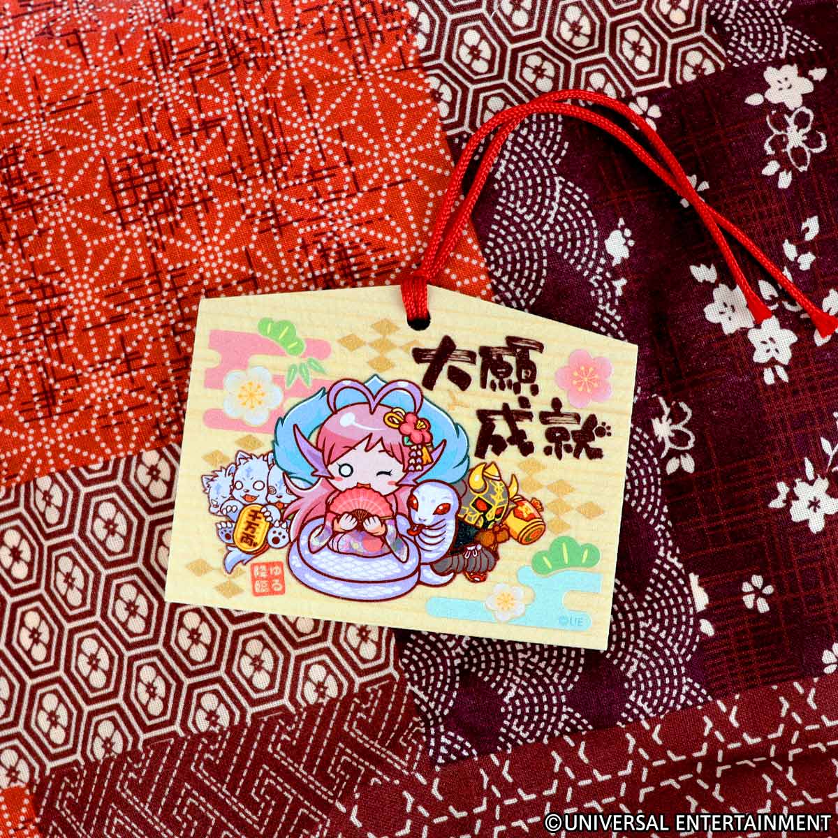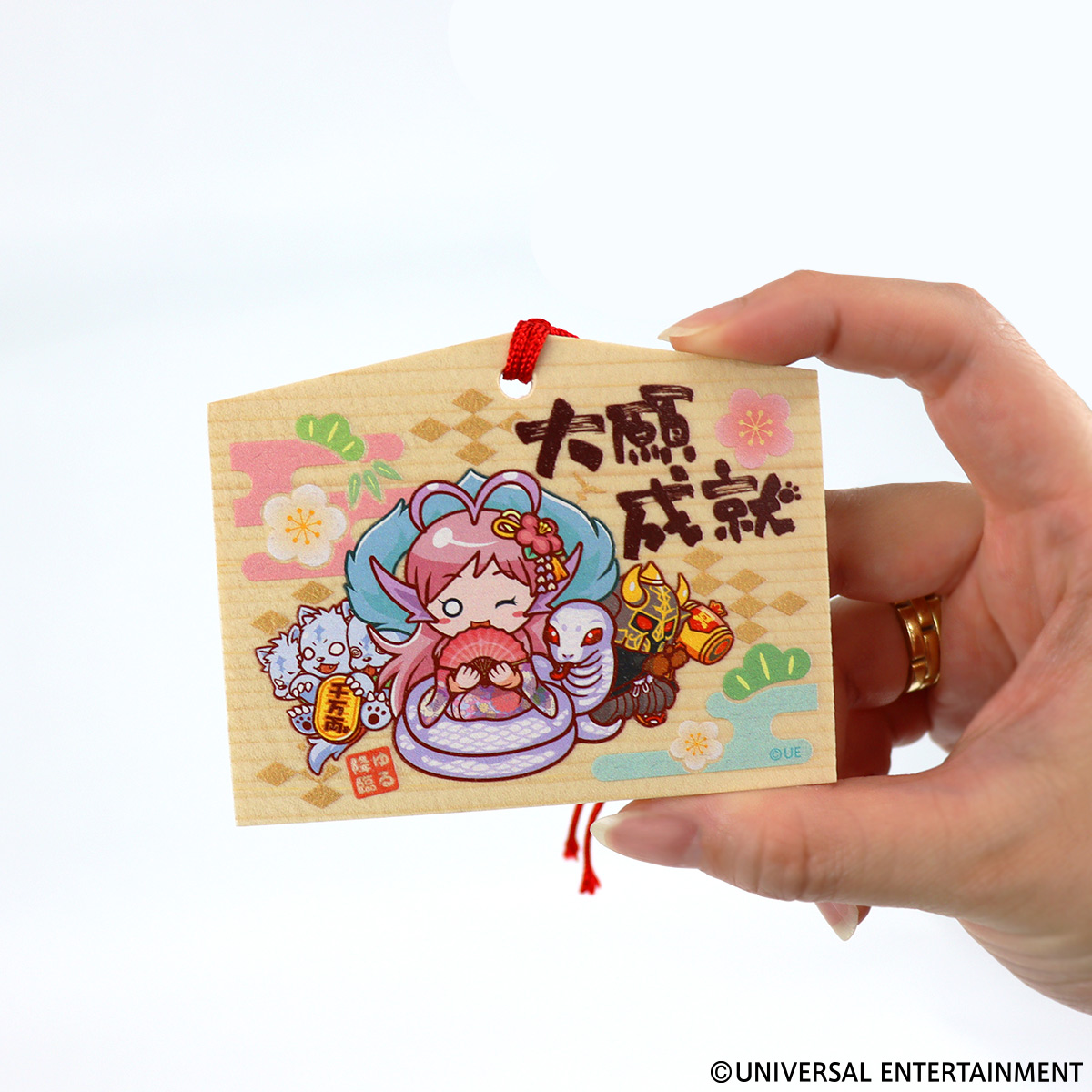 振袖姿のかわいらしいゆるせぽねに、2025年の干支である巳を組み合わせた絵馬。