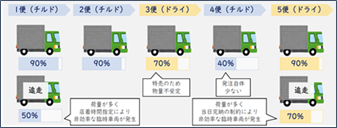 (課題)発注量による便ごとの荷量のばらつきなどで低積載率の発生や、店着時間指定などによるドライバーの作業待ち時間の発生、追走などによるドライバーの長時間拘束などが発生していた。