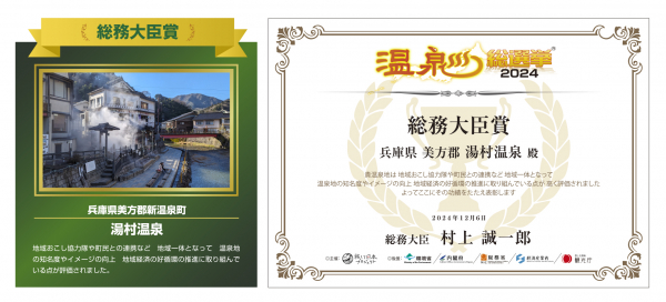 5省庁(環境省、内閣府、総務省、経済産業省、観光庁)の後援で観光地の活性化プロジェクトを実施している温泉総選挙(主催:旅して日本プロジェクト、運営事務局:一社)ジャパンデザイン、本社:東京都渋谷区、温泉総選挙総合プロデューサー/社会起業家:山下 太郎)は、12月6日開催された『温泉総選挙2024』表彰式にて、温泉地の取り組みを評価する省庁賞4賞、特別賞7賞を発表し、総務大臣賞は「湯村温泉(兵庫県美方郡新温泉町)」が受賞いたしました。