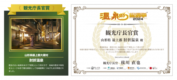 5省庁(環境省、内閣府、総務省、経済産業省、観光庁)の後援で観光地の活性化プロジェクトを実施している温泉総選挙(主催:旅して日本プロジェクト、運営事務局:一社)ジャパンデザイン、本社:東京都渋谷区、温泉総選挙総合プロデューサー/社会起業家:山下 太郎)は、12月6日開催された『温泉総選挙2024』表彰式にて、温泉地の取り組みを評価する省庁賞4賞、特別賞7賞を発表し、観光庁長官賞は「肘折温泉(山形県最上郡大蔵村)」が受賞いたしました。