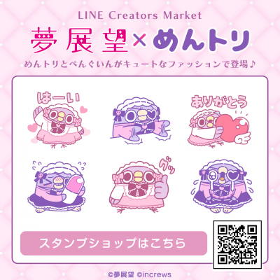 コラボ第1弾は、夢展望が火付け役となった【量産型・地雷系ファッション】の衣装に身を包んだ「めんトリ&ぺんぐいん」のコラボデザインを使用したLINEスタンプとLINE着せかえがインクルーズの販売アカウントより一斉に販売開始いたしました。今後は、台湾・香港・マカオ地域での中文繁体字ver.でのローカライズ配信や、コラボデザインのアパレル販売なども予定しております。
