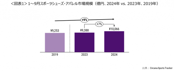 日本の2024年1-9月のスポーツシューズ・アパレル市場規模は約1兆円で前年同期比7%増と、大幅な増加となりました(図表1)。またコロナ前の19年同期比と比べても9%増と、市場は完全に回復しています。