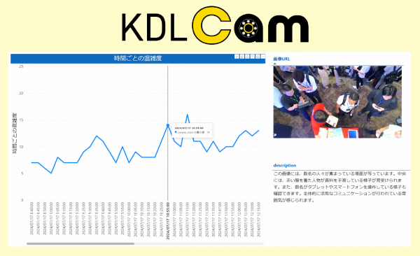 本アプリは、人流解析や物体検知を得意とするKDLのソリューション「KDLCam(ケーディーエルカム)」で開発したもので、展示ブースに設置したカメラ画像を画像認識AIが分析し、ブースにいる人数、混雑状況、人物の服装や行動、改善案などを生成AIが自動でレポートに書き起こします。