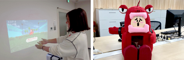 専用のディスプレイや複数のセンサー機器を使わずに空間操作が体験できるアプリを展示します。小型の光学式ハンドトラッキングカメラ(*)1台を首に掛けて手や指を動かすと、カメラがその動きを検知し、モニターに映る物体をつかんだり動かしたりすることができます。展示では、KDL公式キャラクター「デジごん」が蹴るサッカーボールからゴールを守るゲームに挑戦できます。