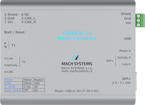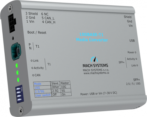 2025年2月25日、東京都渋谷区 - ポジティブワン株式会社は、(チェコ共和国プラハに拠点を置くMACH SYSTEMS s.r.o.社正規代理店)は、新たな自動車用ネットワークソリューションとして、「10GBASE-T1 Media Converter」を発表いたします。本製品は、10GBASE-T1、5GBASE-T1、2.5GBASE-T1の各規格に対応するマルチギガビット自動車用イーサネット(MultiGBASE-T1)と、標準イーサネット(MultiGBASE-T)間の高精度な変換を実現します。MACsec(TC17)およびスリープ/ウェイクアップ(TC10)仕様に対応し、セキュリティと省電力性を両立した革新的な製品です。2025年5月頃から販売を開始予定です。