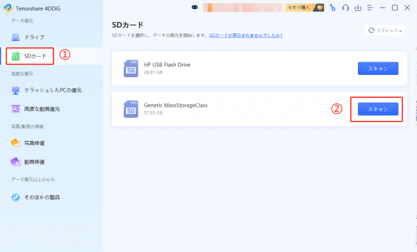 1.Tenorshare 4DDiGを起動し、ドライブレコーダーのSDカードをパソコンに接続して、プログラムが起動後の画面で、「SDカード」を選択して、スキャンします。