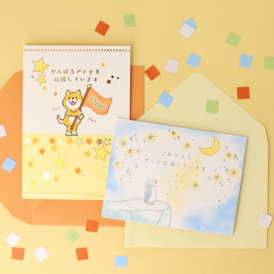 いつも頑張っているあの人に! 「応援」をテーマにした多目的カード。ホログラムの箔線が美しいペンギンと、キュートな犬の応援団のデザインです。