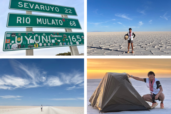奇跡の絶景として知られるウユニ塩湖では、青空と真っ白な大地がどこまでも続きます。世界でもっとも平らな場所としても知られ、浅い湖が「天空の鏡」として雲や星空を鏡面のように映してくれます。ウユニで野営することに決め、いいの選手は満天の星空を堪能しながら眠りにつきました。