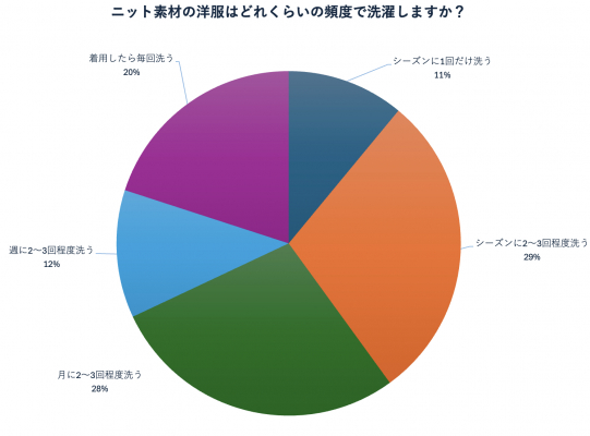 ニット素材の洋服の洗濯頻度について、「シーズンに2~3回程度洗う」が29%で最多という結果になりました。理由としては、縮みやダメージなどが気になり気軽に洗えない、手洗いになるので回数が増えると面倒、などの意見が多く見受けられました。 次点で多かった「月に2~3回程度洗う」も同様の理由が多く、ニット素材の性質上、やはり他の衣料と異なり洗濯の頻度が低いことが分かりました。