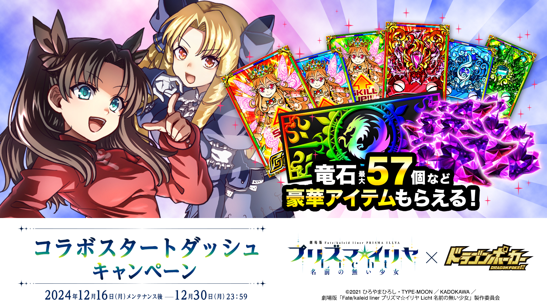 株式会社アソビズム(本社:東京都千代田区、代表取締役:大手智之)は、App Store・Google Playにて好評配信中の『ドラゴンポーカー』と劇場版『Fate/kaleid liner プリズマ☆イリヤ Licht 名前の無い少女』のコラボを記念して、「コラボ開催記念!フォロー&リポストで参加!豪華報酬プレゼントキャンペーン」を2024年12月13日(金)より実施することをお知らせいたします。