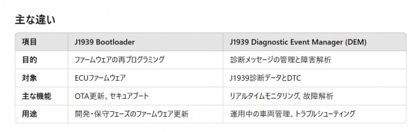 ◆Simma SoftwareのJ1939 BootloaderとJ1939 Diagnostic Event Manager (DEM) は、異なる目的で設計された製品です。それぞれの役割を比較すると次のようになります: