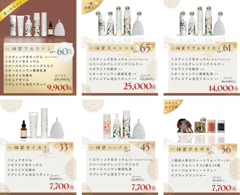 ナチュラル志向のコスメブランド「ルアンルアン」を展開する、株式会社ボックスグループ(本社:埼玉県さいたま市南区、代表取締役社長:姫沼 諭)は、2024年12月18日(水)から「福袋2025」の販売をスタートします。6種のラインナップが最大65%OFF、さらに先着100名様限定の特典もご用意しました。