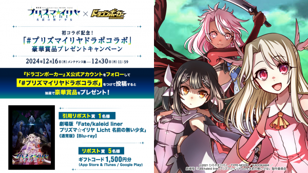 期間中、『ドラゴンポーカー』公式X(旧Twitter)アカウント(@DragonPoker_aso)が投稿するキャンペーン対象ポストに「#プリズマイリヤドラポコラボ」を付けて引用リポストしていただいた方の中から抽選で劇場版「Fate kaleid liner プリズマ☆イリヤ Licht 名前の無い少女」《通常版》【Blu-ray】をプレゼント!さらに、リポストしていただいた方の中から抽選でギフトカード1500円分をプレゼントいたします。奮ってご参加ください。