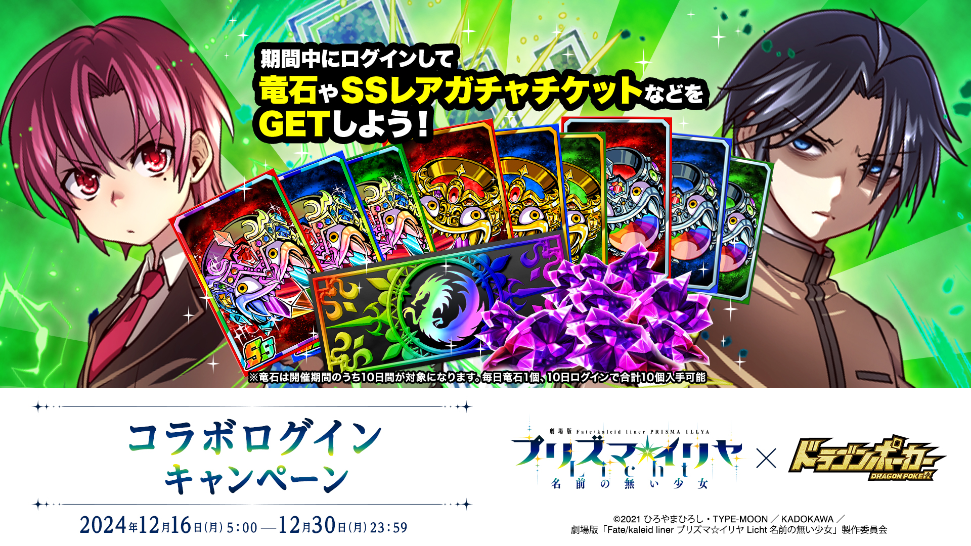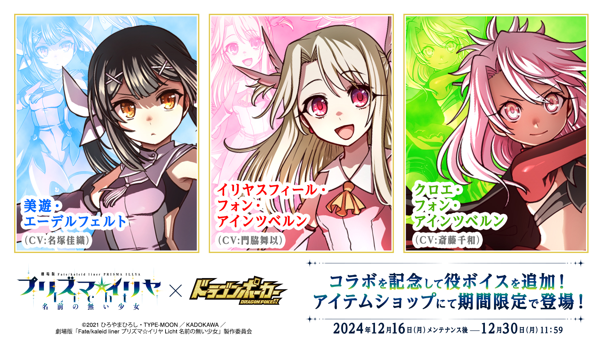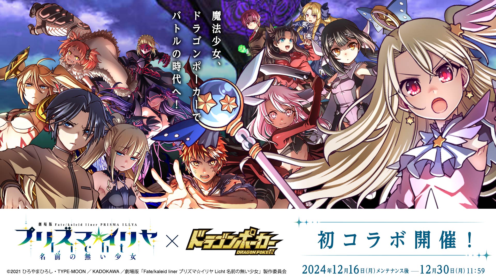 株式会社アソビズム(本社:東京都千代田区、代表取締役:大手智之)は、App Store・Google Playにて好評配信中のリアルタイム合体カードバトル『ドラゴンポーカー』で、2024年12月16日(月)より劇場版『Fate/kaleid liner プリズマ☆イリヤ Licht 名前の無い少女』とのコラボイベントを開催いたします。