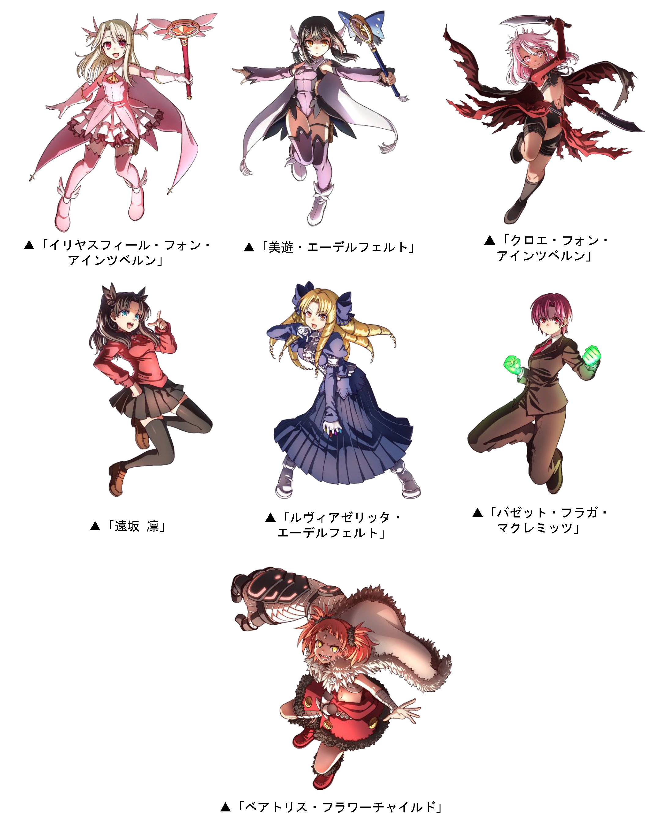 「イリヤスフィール・フォン・アインツベルン」「美遊・エーデルフェルト」「クロエ・フォン・アインツベルン」「遠坂 凛」「ルヴィアゼリッタ・エーデルフェルト」「バゼット・フラガ・マクレミッツ」「ベアトリス・フラワーチャイルド」がドラポに登場!