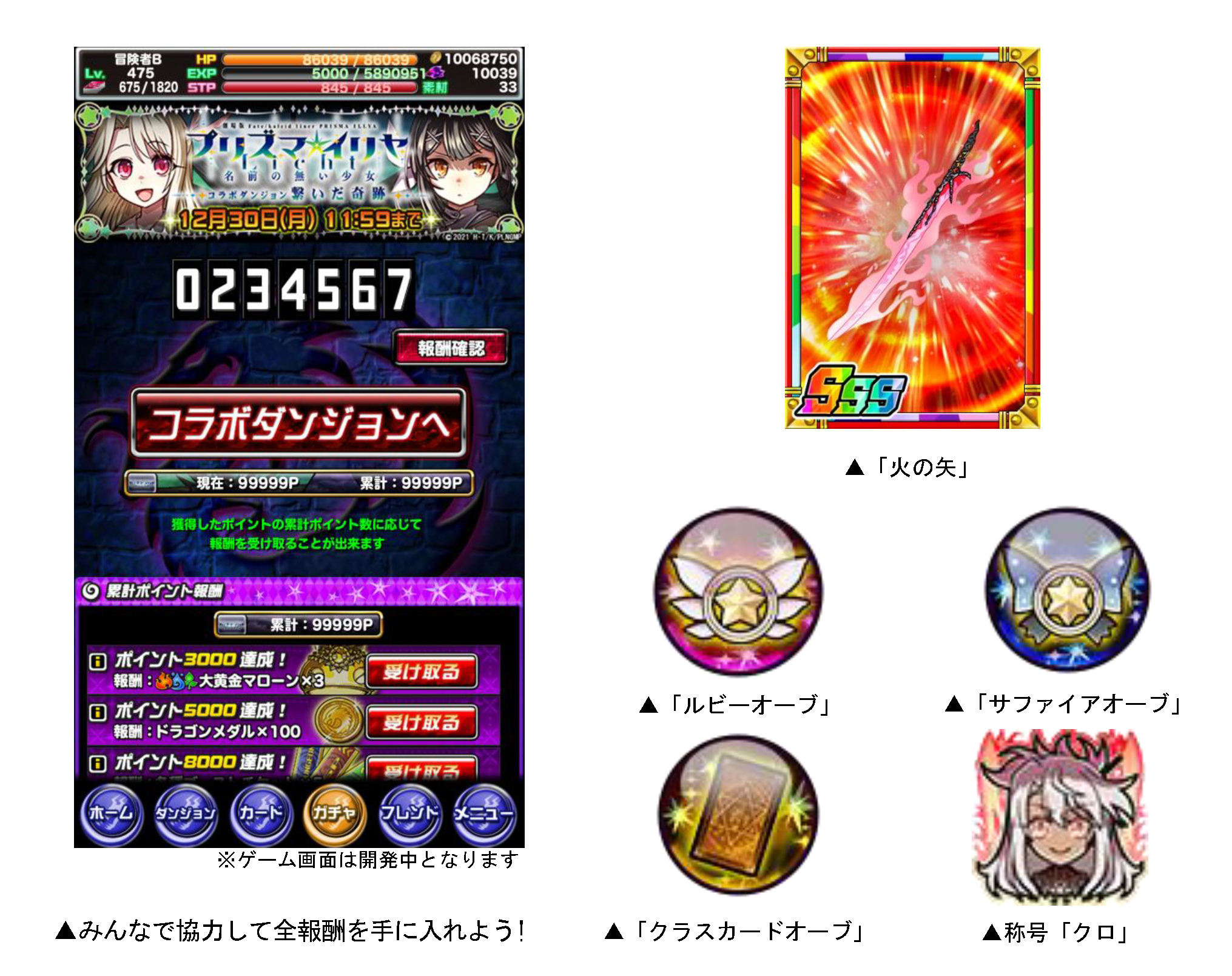 期間中、ゲーム内の特設ページに「協力ミッション」に関する数値が表示され、コラボダンジョンに参加した全ユーザーのクリア回数に応じて、コラボ限定子分カード「火の矢」、コラボ限定オーブ「ルビーオーブ」「サファイアオーブ」「クラスカードオーブ」限定称号「クロ」などが入手できます。たくさんダンジョンをクリアして豪華報酬をゲットしましょう!