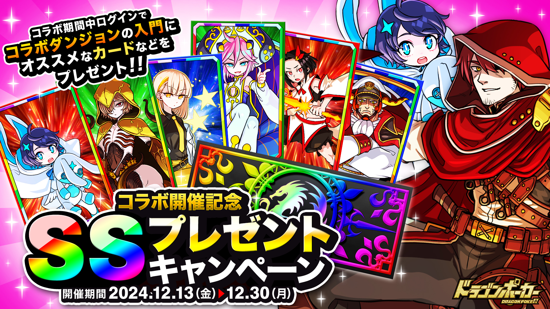 コラボ期間中、全ユーザーに「竜石最大57個」や「SSレアガチャチケット」などをプレゼント!友達を誘ってドラゴンポーカーを楽しみましょう!