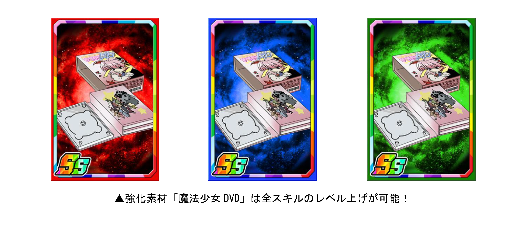 「プリズマP」を使いポイント交換、または素材ガチャを回すとコラボ限定強化素材「魔法少女DVD」を入手することができます。「魔法少女DVD」は経験値がアップするだけではなく、全スキルのレベル上昇率がアップします!