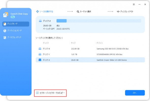 ステップ1. EaseUS Disk Copyを起動します。ソースディスク/パーティションを選び、「セクターバイセクター方式コピー」にチェックを入れます。