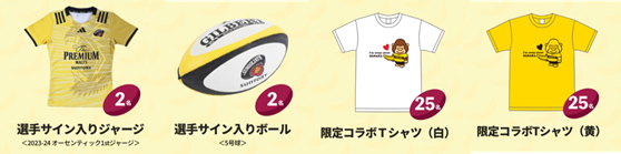 賞品内容: 選手サイン入りジャージ(2名)、選手サイン入りボール(2名)、限定コラボTシャツ白(25名)、限定コラボTシャツ黄(25名)