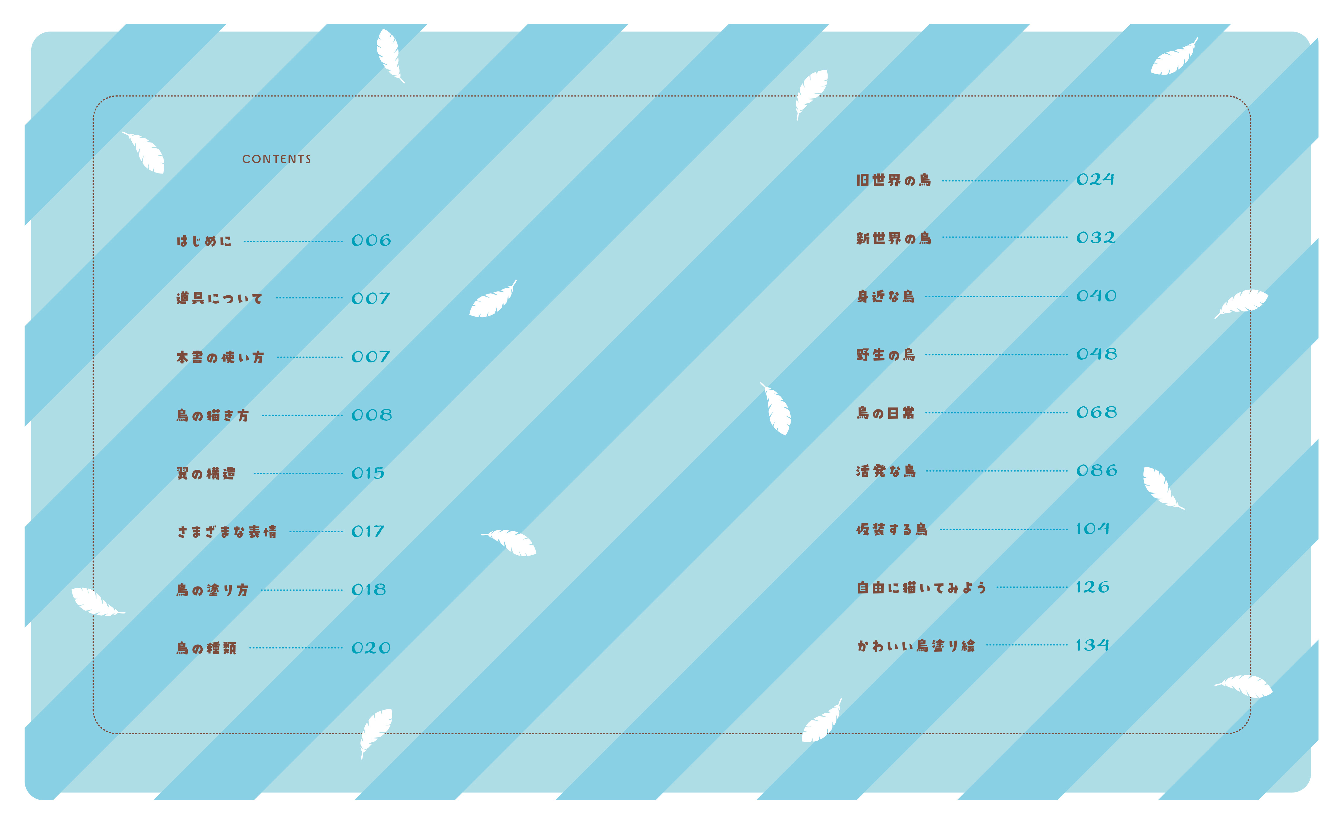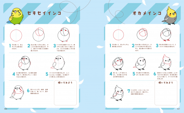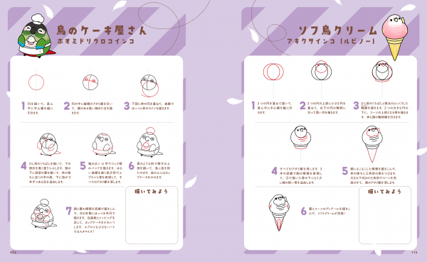 冒頭には鳥の体のパーツの描き方例もあり、イラストを同じように描くだけではなく、オリジナルのかわいい鳥イラストを描く際にとても参考になります。著者はアメリカで鳥の世話などについて学べる「BIRDHISM」というサイトを運営しており、かわいいだけじゃなく専門的見地で描かれているので、鳥たちの「学び」にもつながります。