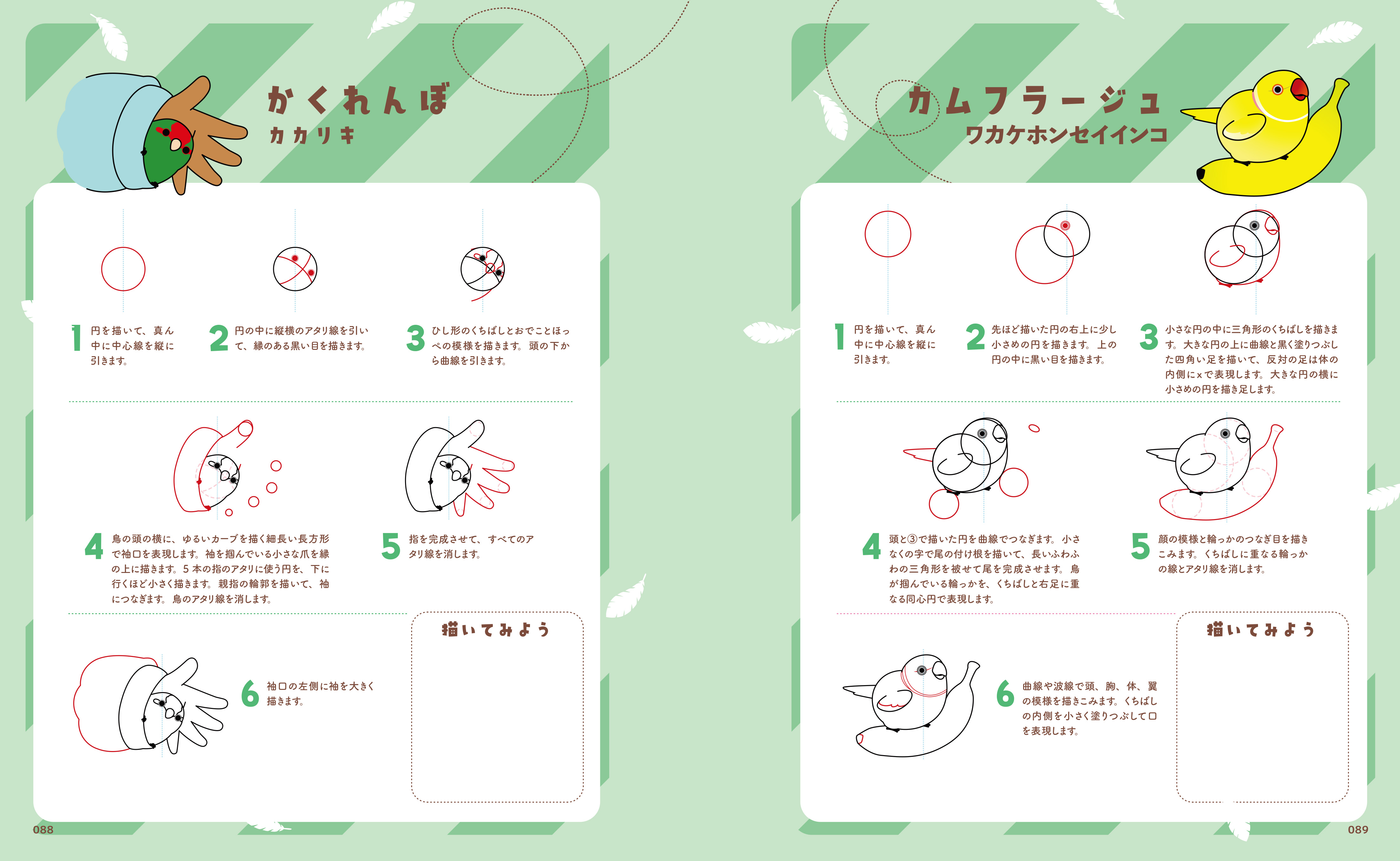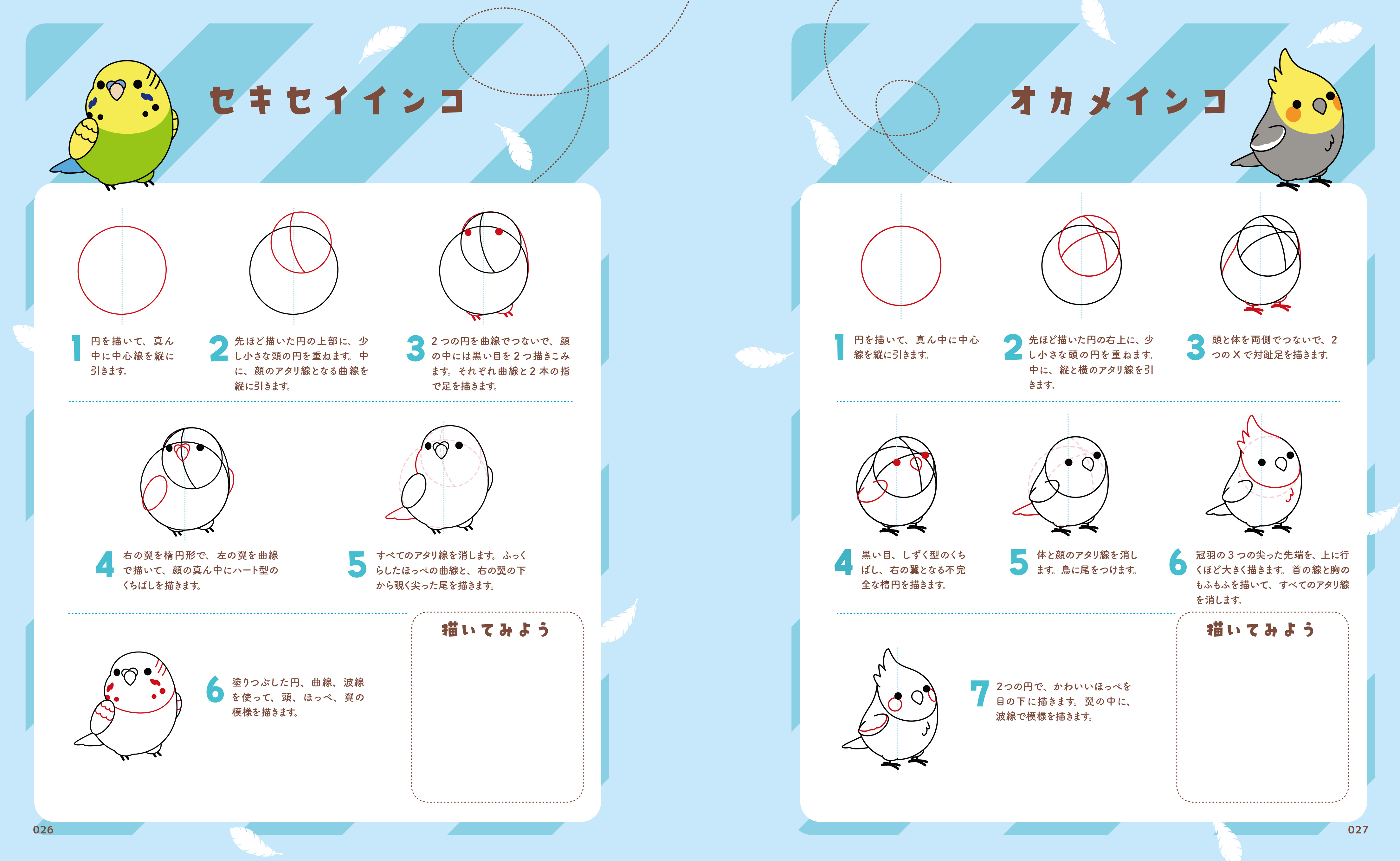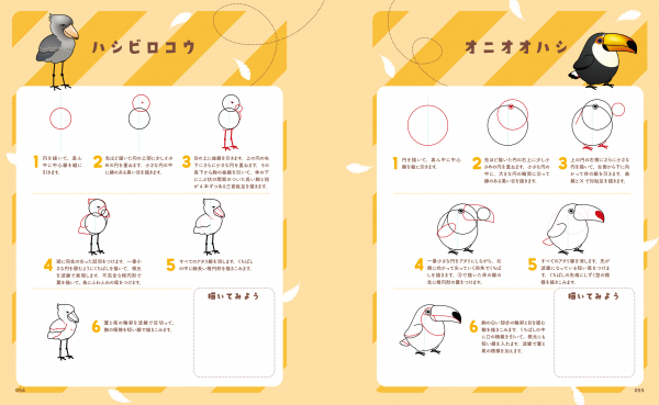 頭は大きく体はぷっくり、愛らしい80種類の鳥イラストをボールペン、マーカー、色鉛筆など、お好きな画材を使って描くことができます。6~8ステップのシンプルでわかりやすい解説に加え、イラストごとに描き込みスペースが用意してあり、ペン1本でどこでも練習できます。