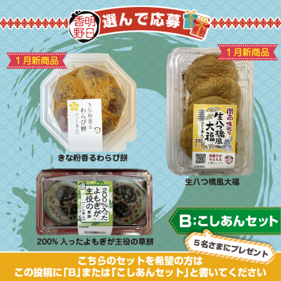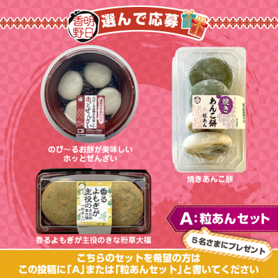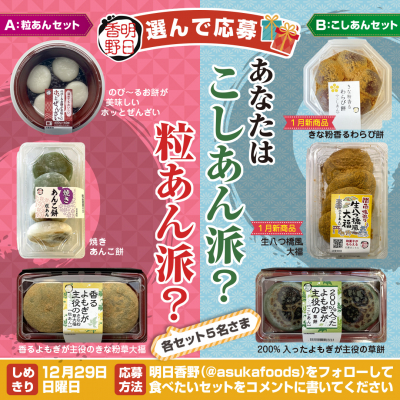 当キャンペーンでは、“もちのプロ”明日香野の焼きあんこ餅やぜんざいを楽しめる「粒あんセット」か、西日本地域で1月から販売する新商品を含む「こしあんセット」どちらかをお好みで選んでご応募いただけます。