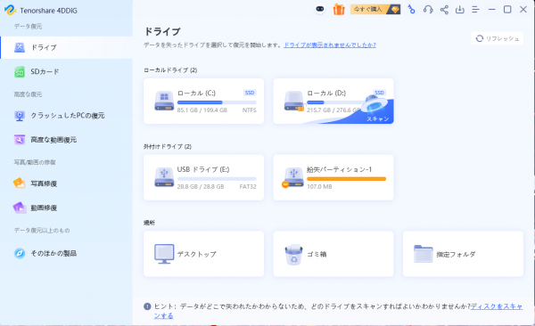 Tenorshare 4DDiGはデータ管理の専門家です。データ復旧、パソコン起動、パーティション管理などのソフトウェアを提供しております。データを復元する以外にも、パーティション管理、クラッシュしたコンピューターからデータを救出する、動画修復等の機能も搭載しています。