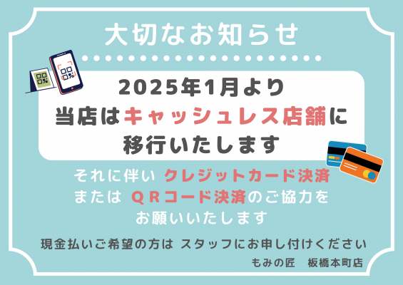 2025年1月よりキャッシュレス決済店舗に移行させていただきます。