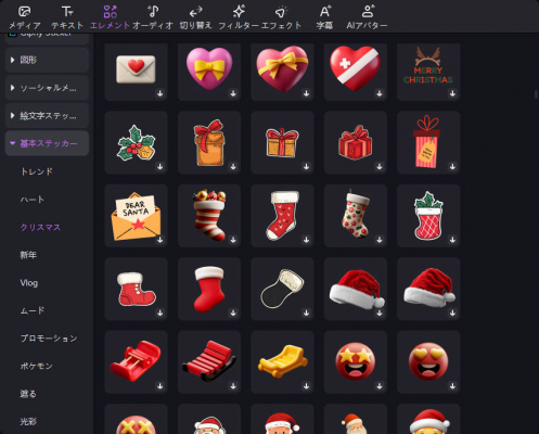 クリスマス向けの可愛らしいサンタクロースステッカーやフィルターで、動画をもっと楽しくデコレーションできます。